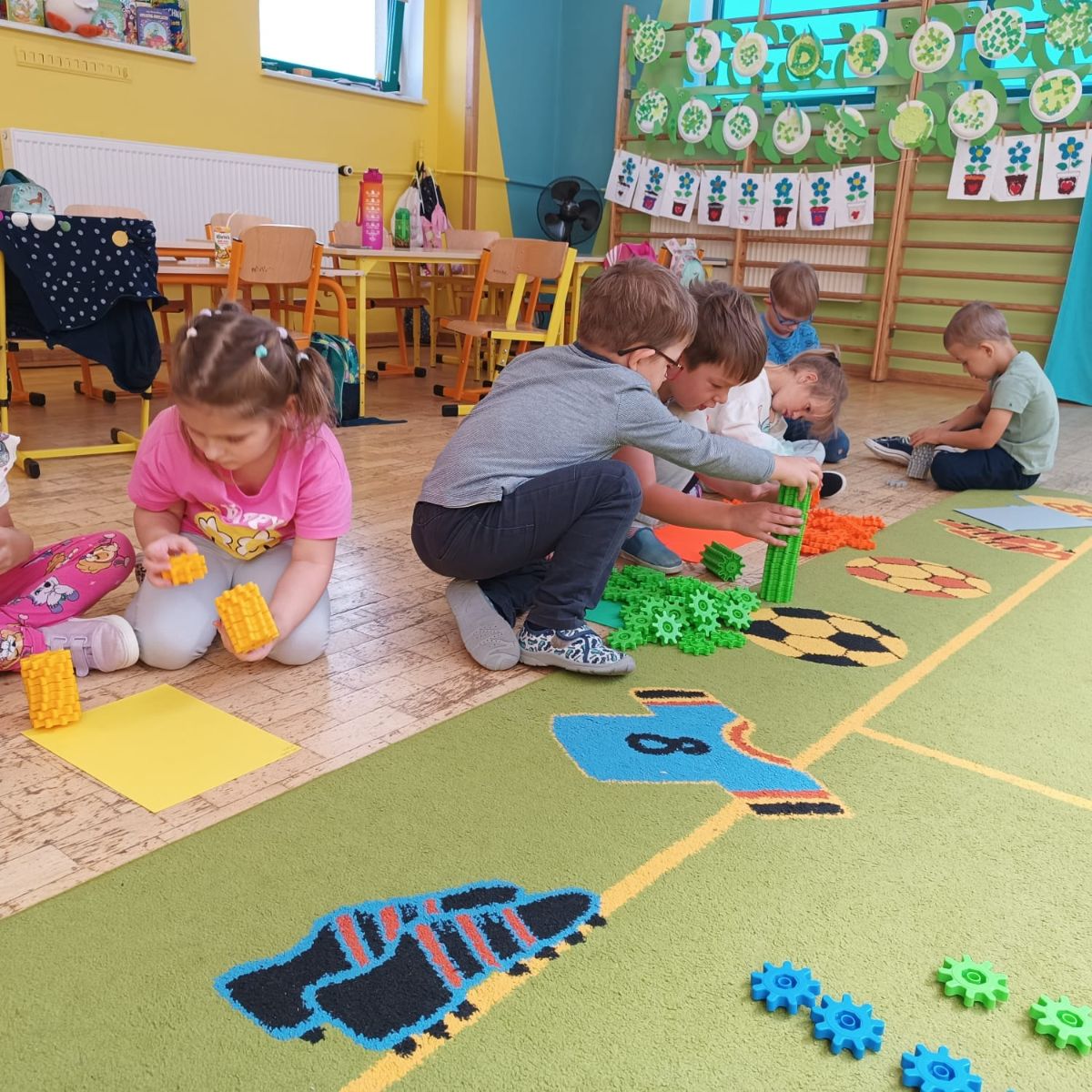 Dzieci wykonały zadanie „Kolorowe wyspy”, pracując w grupach dwu/trzyosobowych. Przyporządkowywały elementy, ustalały nazwy klocków (platforma, zębatka, walec...) oraz rozpoznawały relacje występujace między przedmiotami: większy–mniejszy, dłuższy–krótszy, taki sam–inny.